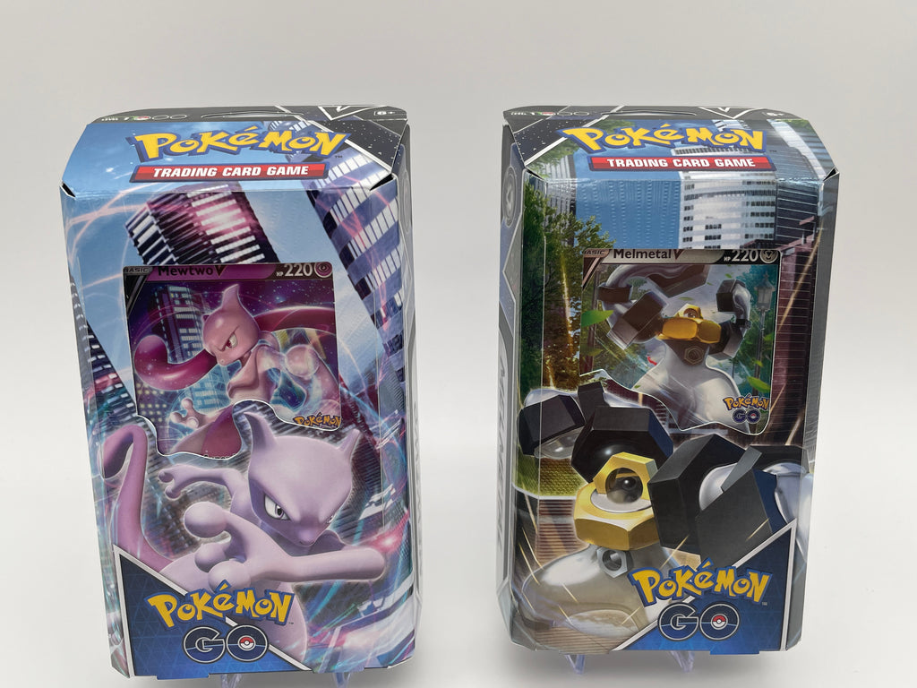 Unleash mental might or metal mayhem with a deck led by Mewtwo V or Melmetal V with Pokémon TCG: Pokémon GO V Battle Decks. Mewtwo V leads an elusive team of Psychic-type Pokémon, while Melmetal V brings the crushing power of Metal types. Land quick hits turn after turn, keep Energy in play, and master all the tricks of these two V Battle Decks!